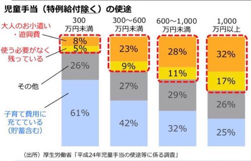 ひとつ前のブログで、児童手当についての話題をとりあげました。 www.shiratamaotama.com 簡単にまとめると下記のようになります。 日経新聞による報道 ・児童手当を「大人の小遣いに充てる」「使わずに残っている」人は年収600万~1000万円未満で39%、1000…