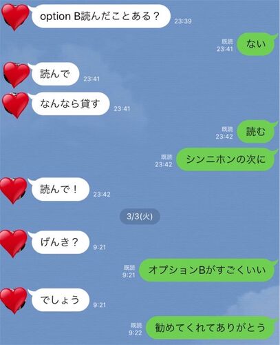 友人から突然LINEで質問されました 友「option B 読んだことある?」 私「ない」 友「読んで」 めっちゃ良い本でした この本は、 FacebookのCOO(最高執行責任者)であるシェリル・サンドバーグ氏が最愛の夫を突然失い、悲しみと絶望の日々を過ごし、そして…